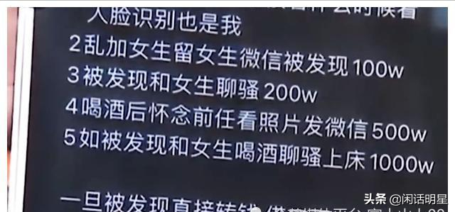 1、你的手机,我能随时翻看和检查,我的人脸,也是开机密码之一。2、如果你乱加女生的微信,和女生微信聊天,被发现后,罚款100万元。3、如果和女神(什么人、哪个人是女神没有定义)“骚聊”(大概是聊私密、暧昧的话题吧),罚款200万元。4、喝酒后如果怀念前妻,看她的照片(不喝酒是可以的吗?),发微信给她,罚款500万元。5、和其他女生喝酒、骚聊、上床,罚款1000万元。备注:一旦被发现直接转钱,借口不听(也就是说,不能找任何借口吧);身边人发现有上述情况,都可以举报。举报者能够得到罚款金额的50%。汪小菲就是不给钱,我也会给你。