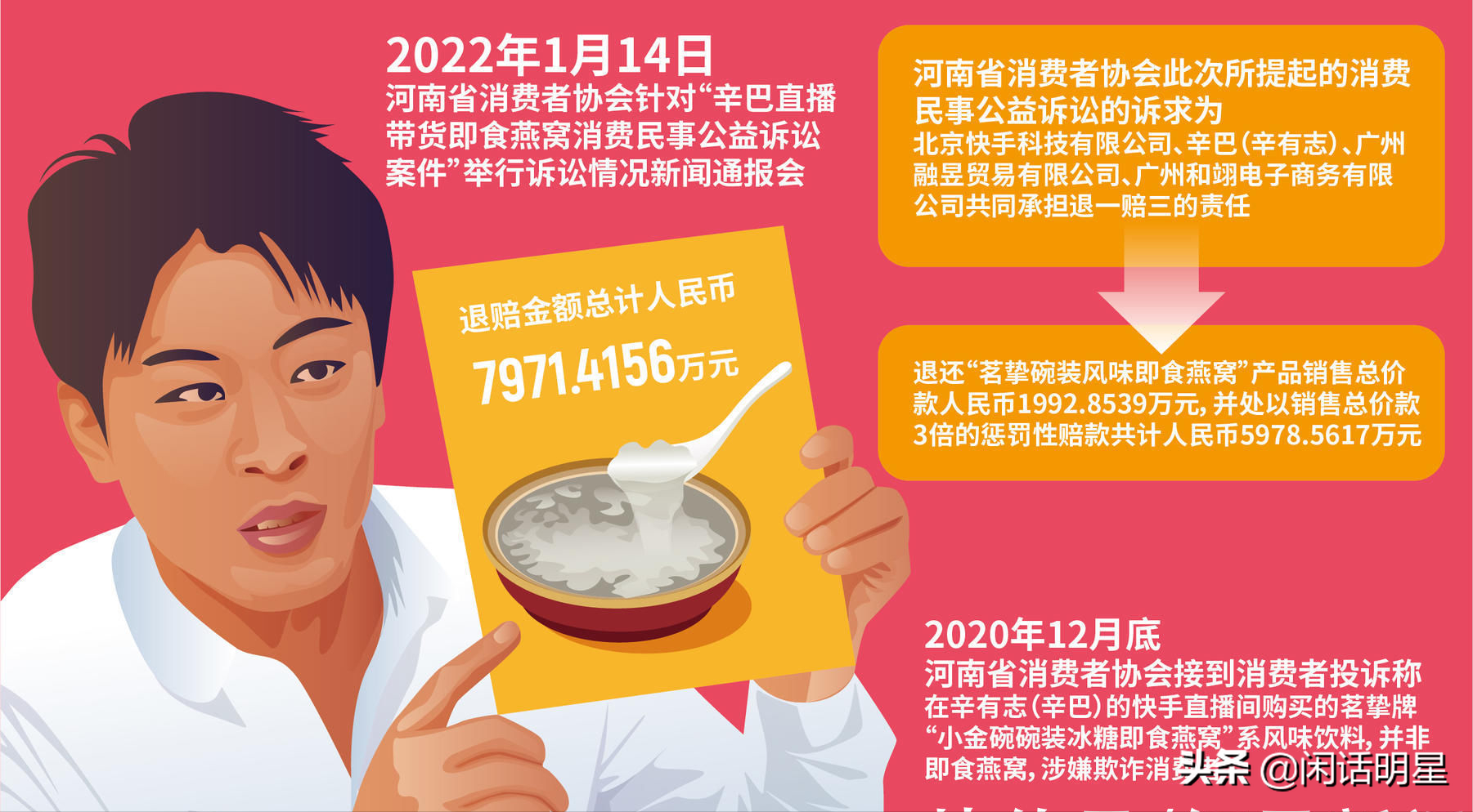 只是,后来证实,辛巴所贩卖的“燕窝”,就是糖水,是彻头彻尾的假货。辛巴还有他的团队,贩假证据确凿,被有关部门不痛不痒地罚了几个钱(90万元和辛巴的2370个亿相比,真是九牛一毛),又关闭了几个月的直播间了事。据说,辛巴卖假货这事,要是在美国,可能要让他真正倾家荡产,再坐几十年大牢,根本就不可能有他嘚瑟的机会。