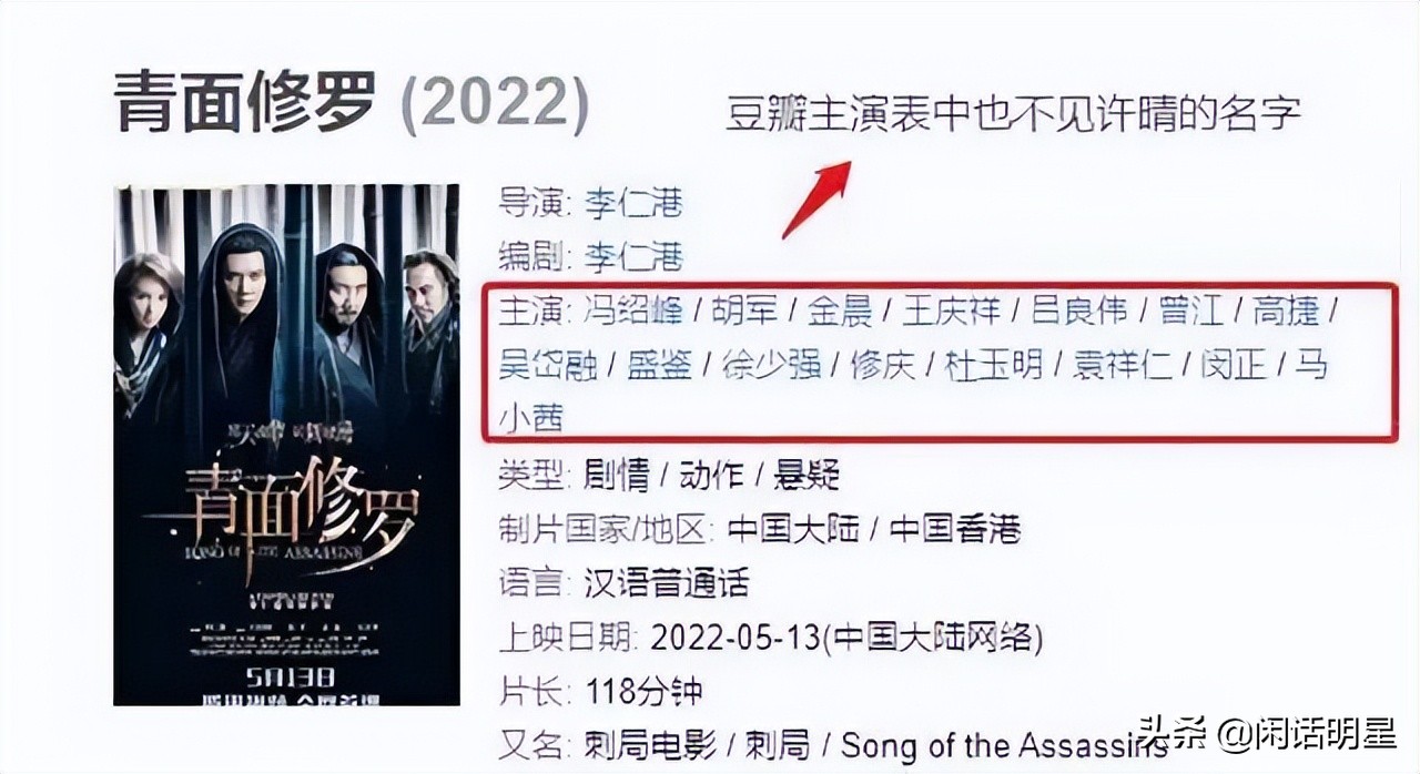 据悉,电影《青面修罗》拍摄于4年前的2018年。这部电影是根据网络小说《刺局》改编而成的,故事的主要情节,是讲述主人公齐君元的成长经历。这部电影的编剧和导演都是李仁港,男一号是冯绍峰、男二号是胡军,女一号是许晴,女二号是金晨,还有吕良伟等诸多大咖参加了演出。据说,这部电影已经修改了多次,直到今年5月13日,才获准在平台上播出。