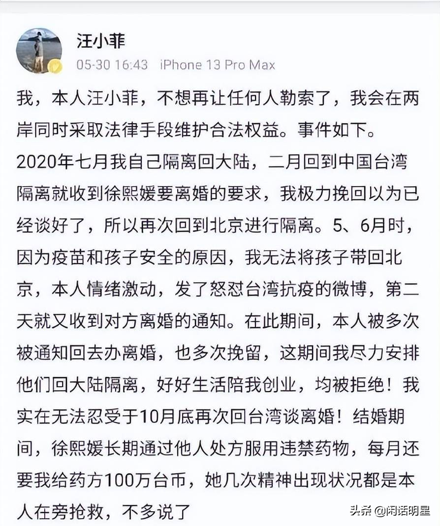 接着,汪小菲再发一条动态。说他不想再被任何人勒索(究竟有多少人掌握了他的多少秘密,要勒索他啊),他要在北京和台北两个地方“采取法律手段”,维护他自己的合法权益。接下来,就把他和大S离婚的经过,说了出来。他写到,2021年2月份,他从北京到台北,还在隔离期间,大S就向他提出了离婚的要求。他不愿意离婚,竭力挽回。他认为已经和大S谈好,就返回了北京。