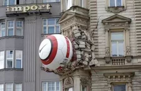 巨大的耐克足球猛撞进了一栋建筑的侧面。