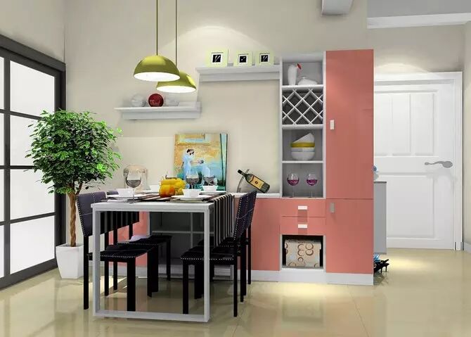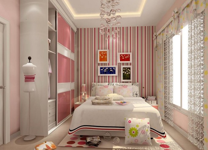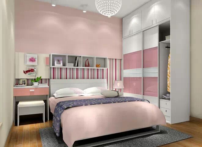 色彩上以白色为主体,搭配以酒红、玫瑰红、粉红等烤漆面板,粉暖色调的搭配立刻营造出一种温馨浪漫的卧房氛围。