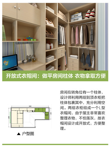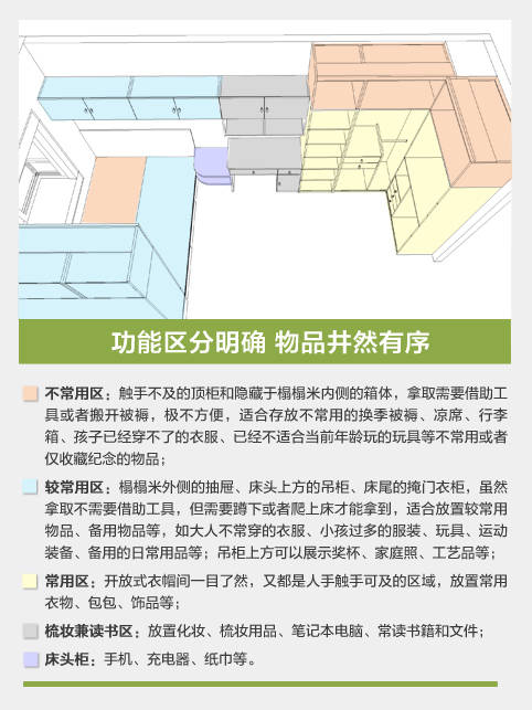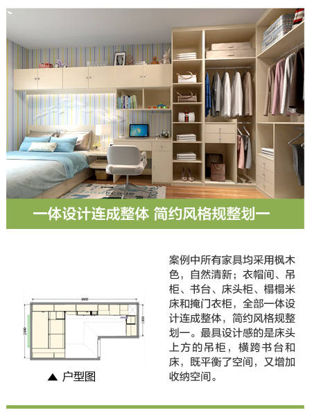 卧室中,衣帽间、吊柜、书台、床头柜、榻榻米床和掩门衣柜,全部一体设计连成整体,简洁清新;依次划分空间为大人储衣区、梳妆区、睡眠区和小孩储衣区,使用方便;榻榻米床和开放衣帽间经济实用,符合屋主装修预算。