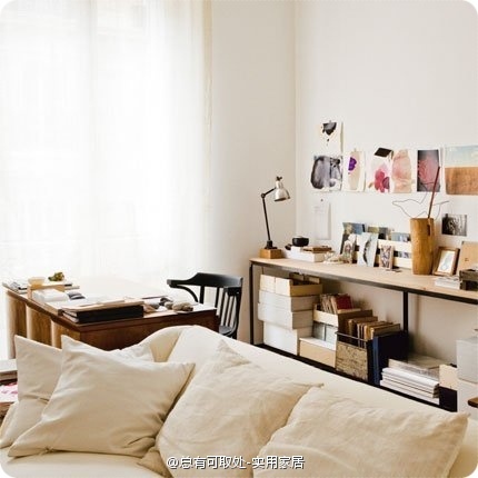 非常有趣的一个兼具办公作用的客厅布局:沙发放在屋子中间,靠墙放边柜,窗边放一个小工作台。建议面宽超过3.5米、整屋超过20平米的的房间使用,尤其适合方形客厅。
