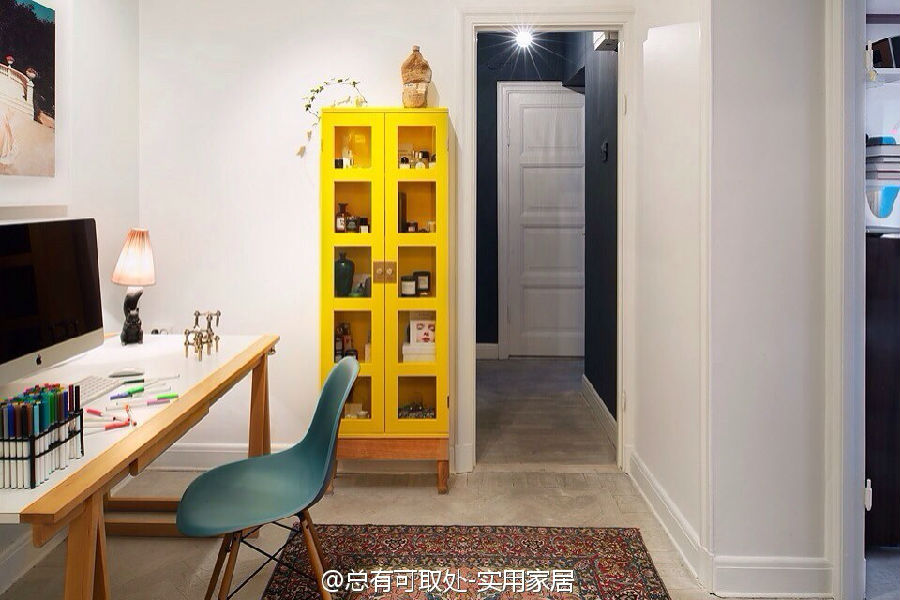 明黄色的小柜子,看起来已经撑出了整个家的气场。走廊是个不尴不尬也无甚实际用途的幽暗小空间,不如干脆用深色让它型到底!