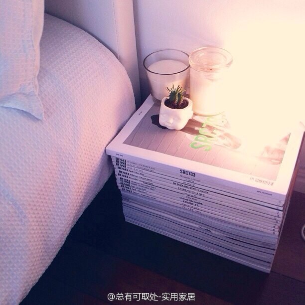 几本杂志,一盆植物,一瓶杯蜡,一盏小灯,床头好得很简单。在简陋的出租房的夜晚,也会文能舒适。