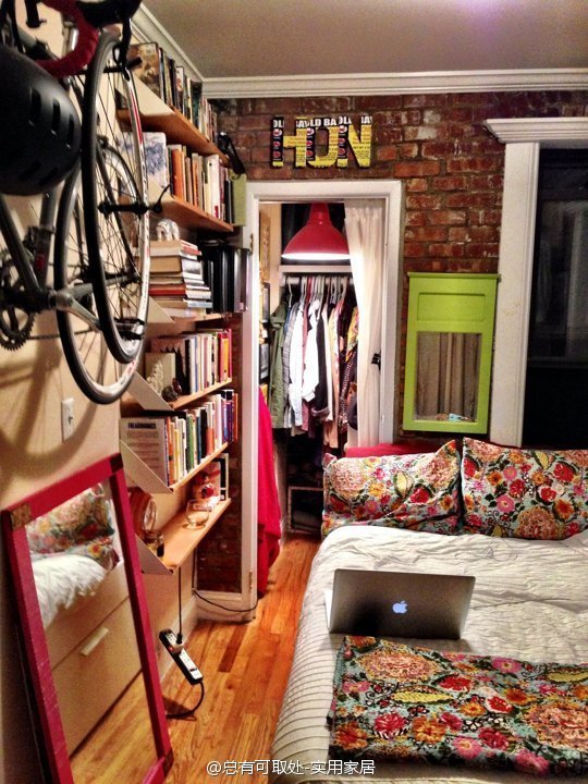 只看这个角落,信息量已经很大,让我幻想到,如果你有一个小一居,衣服又多到不行,可以把客厅当卧室,把小房间当走入式衣橱!