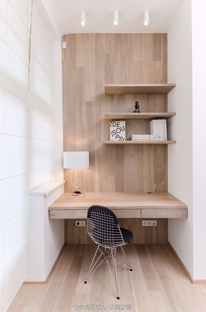 典型的可以用阳台改造的定制工作区,规划很合理,顶部射灯的设计也很到位,一定学走。