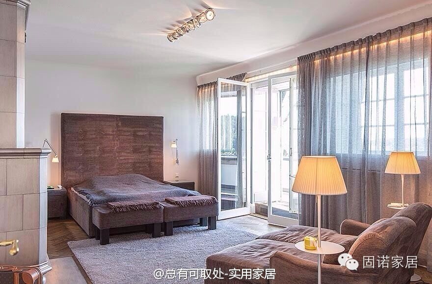 灰色麻质窗帘搭配灰色地毯,两个贵妃榻拼在一起特别有爱又舒适,带搁板的落地灯连茶几都省了。