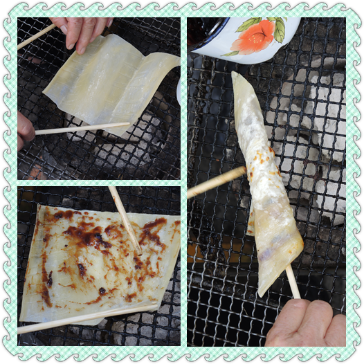 (是呀,上次从云南回北京的两年里,她还真的念叨过好几次烤乳扇呢)。老奶奶现场为我们烤制了一个乳扇,她说:“现做的好吃!”娴熟稳健的手法,充足地道的用料,整张的四方形乳扇(有的摊位是用三角形的乳扇,从面积看,我们猜是四方形的按对角线一分为二吧?瞎猜的,不一定对呀