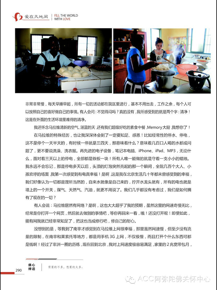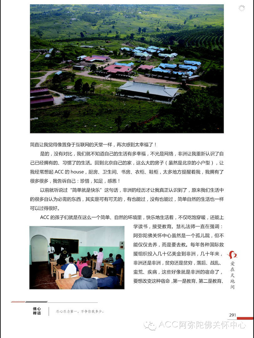 ACC的孩子们就是在这么一个简单、自然的环境里,快乐的生活着,不仅吃饱穿暖,还能上学读书,接受教育。慧礼法师一直在强调:阿弥陀佛关怀中心虽然是一个孤儿院,但不能仅仅去养,而是要去教。每年各种国际救援组织投入几十亿美金到非洲,几十年来,非洲还是非洲,贫穷还是贫穷,落后、战乱、蛮荒、疾病,这些好像就是非洲的宿命了,要想改变这种宿命,第一是教育、第二是教育、第三还是教育!我们要用中华文化和佛教信仰做为养分,来滋养非洲的文化、非洲的民族,使他们更成长、更茁壮,从而成为具有慈悲、智慧与愿力的新一代的非洲人!