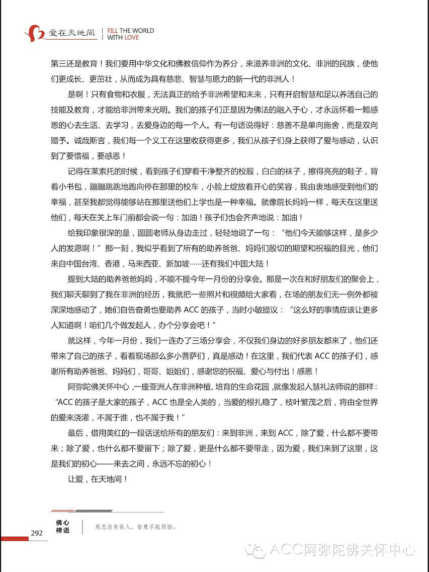 阿弥陀佛关怀中心,一座亚洲人在非洲种植、培育的生命花园,就像发起人慧礼法师说的那样:“ACC的孩子是大家的孩子,ACC也是全人类的,当爱的根扎稳了,枝叶繁茂之后,将由全世界的爱来浇灌,不属于谁,也不属于我!”