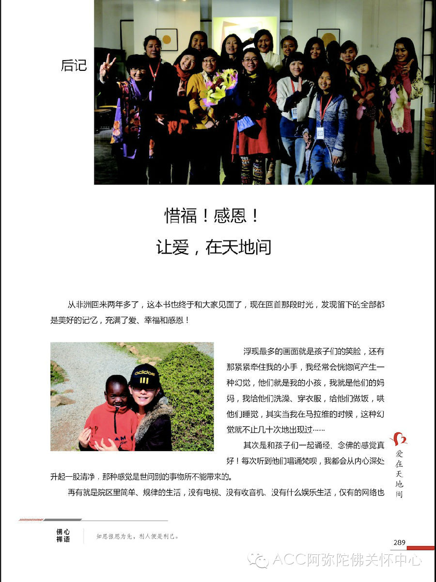 最后,我借用美红的一段话送给所有的朋友们:来到非洲,来到ACC,除了爱,什么都不要带来;除了爱,也什么都不要留下;除了爱,更是什么都不要带走,因为爱,我们来到了这里,这是我们的初心——来去之间,永远不忘的初心!