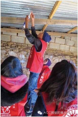 修缮窗户,是我们现在能做的。孩子的椅子是地板或是石块;桌子则是双腿。相对于修缮这几片窗户的小小付出,能换得学生满足灿烂的笑容,对我们而言真是太值得了!因为隔天,我们从副校长辗转得知,小朋友到学校时,看到窗户全被修好了,开心的不得了!