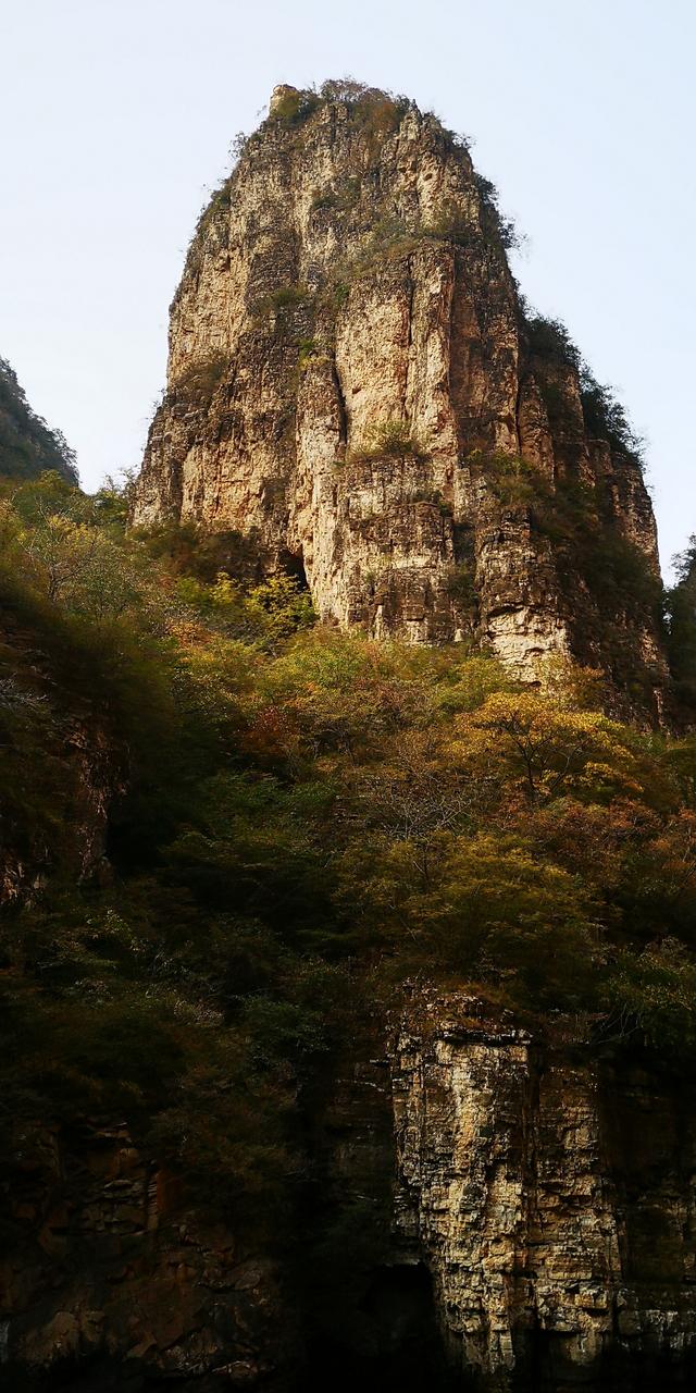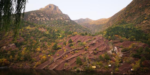 按原路往售票处方向走,河边红色的山体上,或绿或黄地生长着树木,构成了一幅秋天的美丽画卷。