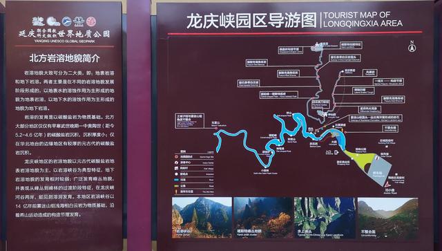 园区导游图,感觉不如之前的观光地图详细和直观。作为延庆世界地质公园的一部分,旁边还有北方岩溶地貌简介。