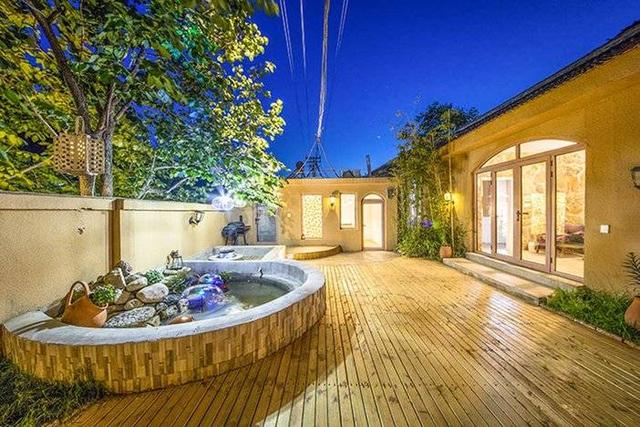 院中的浅水池到了夜晚在金黄色的暖光之下,显得特别剔透晶莹,整个院中的房子都映在水中,这画面好似山中仙境一般。
