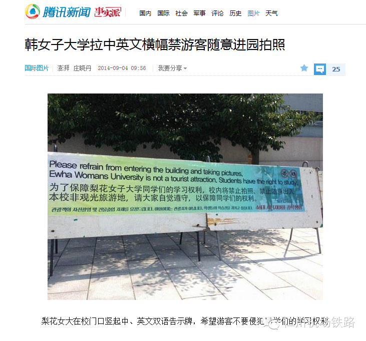 去年九月初腾讯网发表了“韩女子大学拉中英文横幅禁游客随意进园拍照”的报道,引起不小的影响。这导致一些打算赴韩国游的中国人误以为梨大真的不让中国人进去参观。