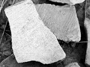 我们走到古城的东北角上,最后的两处残垣断壁前,三块巨大青色石条依次摆开,上面堆放着村民们耕地时翻出来的残损建筑材料,看得出来村民对这座千年古城有着很深的情感。