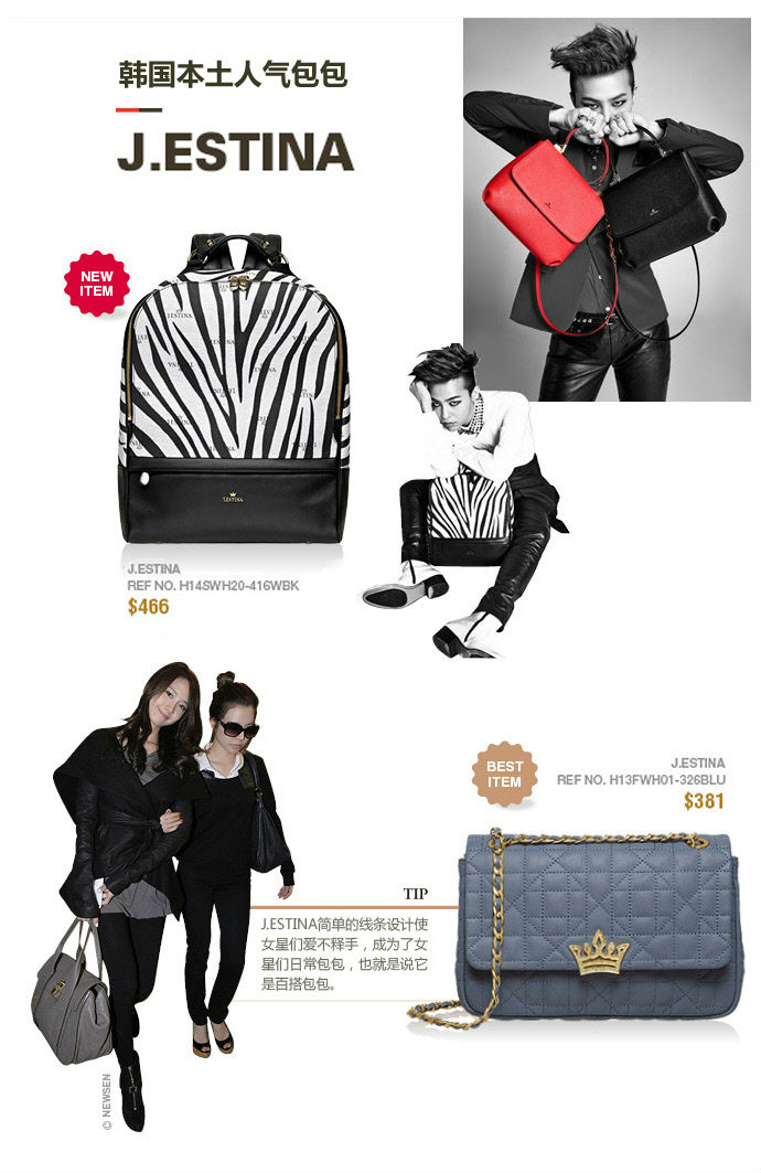 世界顶级时尚明星权志龙最近不管在哪里都会背J.ESTINA的包包。目前权志龙在机场背的斑马图案的背包成为了大家最关注的包包!韩流新王者GD权志龙与J.ESTINA时尚大碰撞!以“Beyond Icon”为主题的LETO系列,GD用他超凡的个人魅力和时尚敏锐度展现了品牌包包的设计精髓,完美的消化了女包的代言!GD机场背过的该款双肩包在韩国更是人气爆棚!绝对是时尚潮人的不二之选!