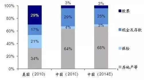 对比中美两国家庭财富的构成,可以大体看出股票市场在中国和美国扮演的不同角色。美林银行研究部的数据显示,2015年中国家庭财富接近六成配置于房地产,其次是银行存款,占比23%。股票与不动产之比为约为1:28;而美国家庭财富中房地产、股票及养老金分别占比27%、26%、23%,存款占比仅12%,股票与不动产之比接近1:1。(参见图5)