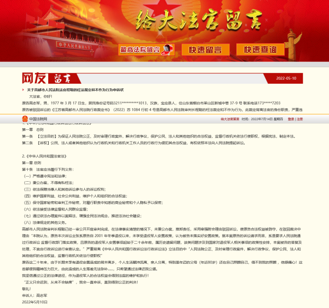 (因“枉法裁判”,高邮法院程聪法官被退役军人投诉。)