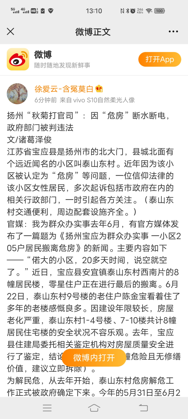 “据了解,2022年6月20日上午,高邮法院法官2人在宝应县就房屋是否为危房进行询问,参与询问的人有高邮法院法官2人、宝应县住建局2人、泰山居委会主任邱家翠、党支部书记刘凯、居民代表1#楼杨奶奶、9#楼倪爹爹、10#楼乔润云、13#楼郎奶奶以及中途离开的李万银。据其中一人告知,其本人是初中学历,因为调查记录中所写内容不属实而谎称不会签字,遂未签字。需要指出的是,该调查程序在判决书中未提一字。其次,判决书做出日期也是2022年6月20日当天,或为调查未结束前做出。第三,一审法院明知在案证据不足以认定被上诉人的行为合法,却主动前往宝应调查证明被诉行政行为合法的证据,违反行政诉讼法第四十条规定。”徐爱云在上诉状里称。