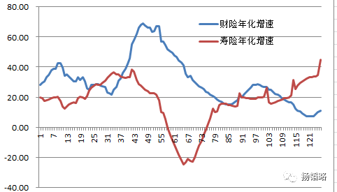 中国平安公布的2017年1月份的保费收入中财产险出现了20%的增速,而寿险则出现了40%的增幅,让人眼前一亮。尤其是寿险业务,出现了10年来的最高年化增速,如下图: