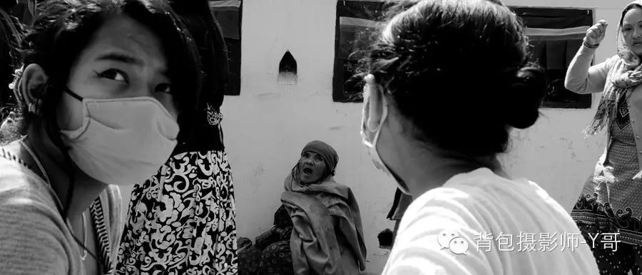 用口罩盖住半张脸的两个女人,视线慌乱,远处的妇人,呼喊着,孤寂而绝望